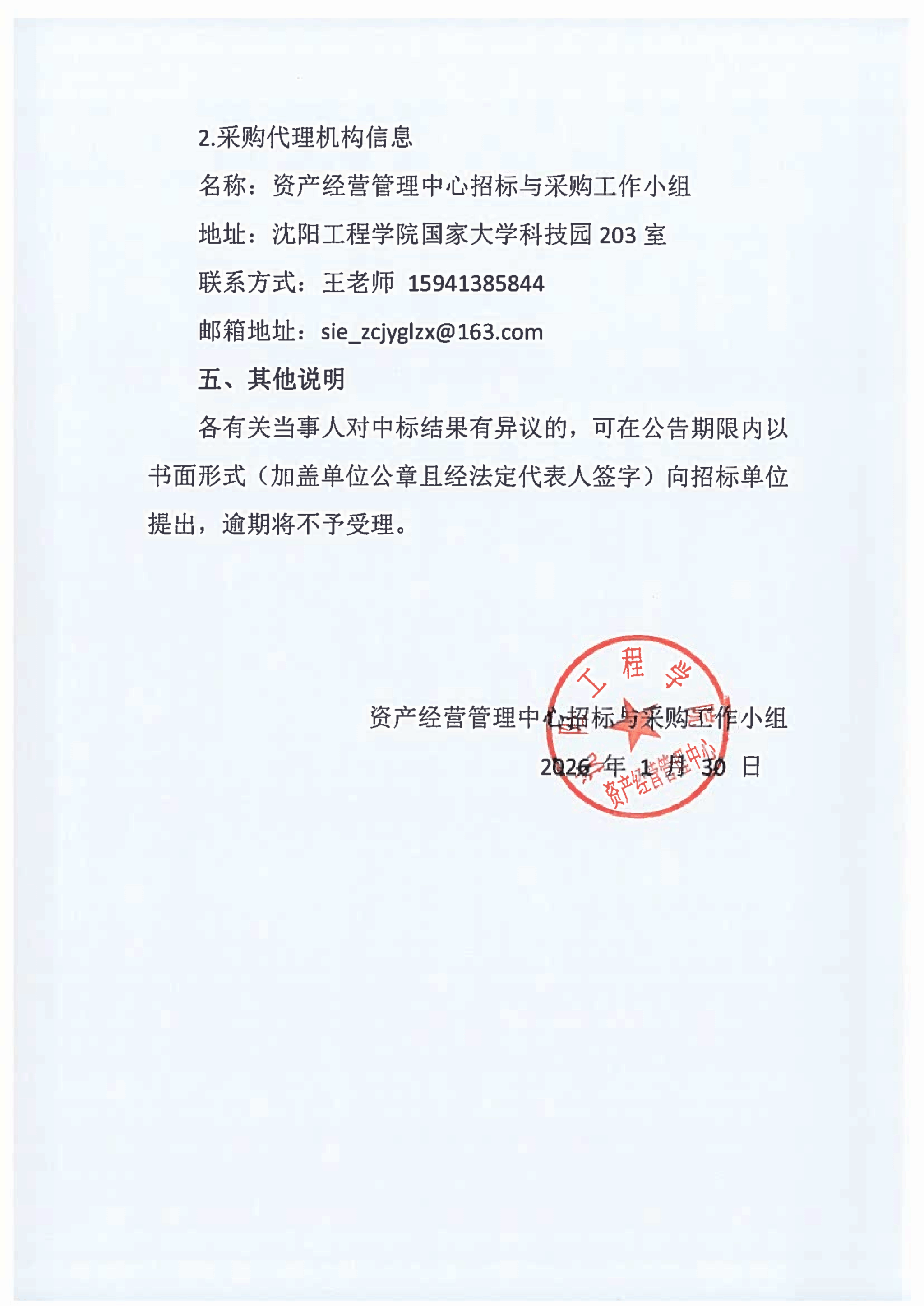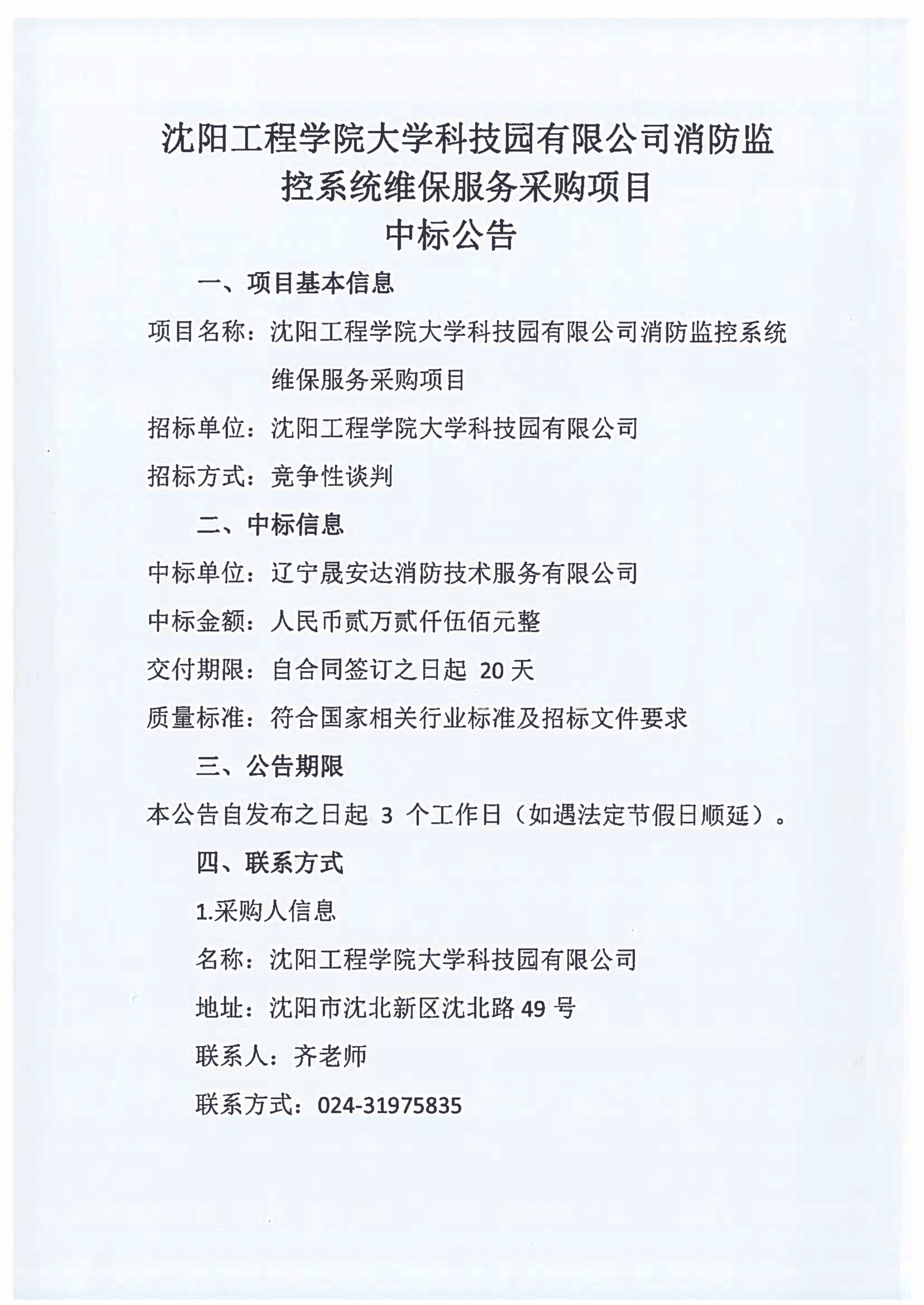 沈阳工程学院大学科技园有限公司消防监控系统维保服务采购项目中标公告