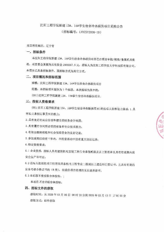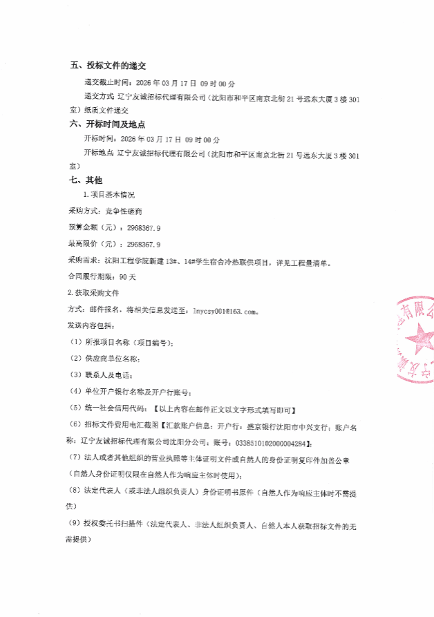 沈阳工程学院新建13#、14#学生宿舍冷热联供项目采购公告