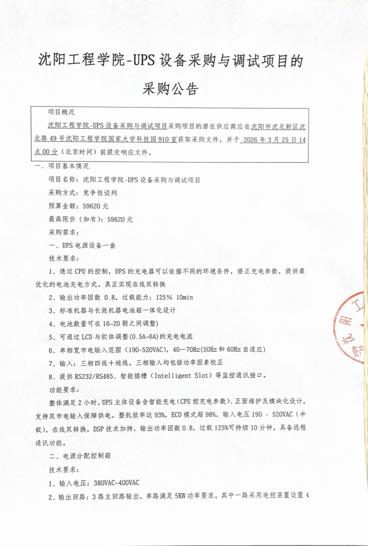沈阳工程学院-UPS设备采购与调试项目的采购公告