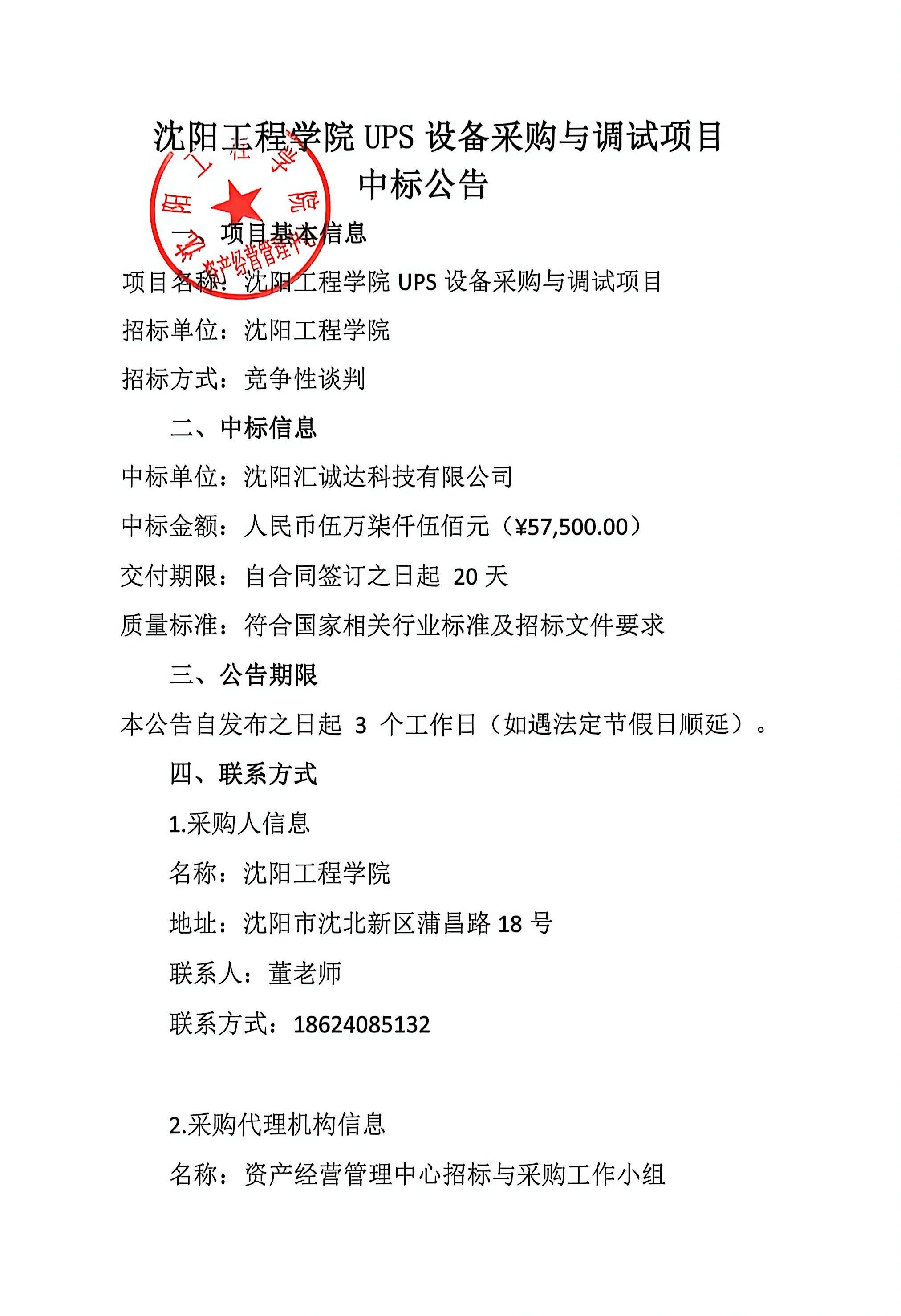 沈阳工程学院-UPS设备采购与调试项目中标公告